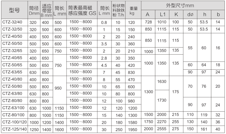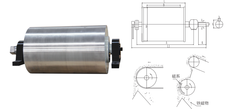 CTZ型中場強半磁滾筒(CTZ型中場強全磁滾筒結構與RCT型參數(shù)等同),多用于對粉狀、顆粒狀、小塊狀物料的凈化處理,或對鐵質的回收利用,對防止破碎機、研磨機、壓榨機的破壞和磨損起著可靠的保護作用。它安裝方便、吸力強、無能耗、連續(xù)工作、操作簡單。根據(jù)TD-75型帶式輸送標準設計,能滿足廣大用戶對高場強、大深度除鐵的使用要求。廣泛應用于冶金、陶瓷、磨料、磨具、金剛砂、非金屬礦、耐火材料、礦山、食品、化工、玻璃、建材等行業(yè)。二、示意圖